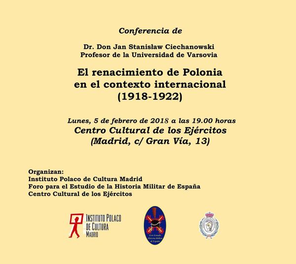 El próximo día 5 de febrero en el Centro Cultural de los Ejércitos de Madrid, a las 19:00h dará una conferencia el Dr. Jan S. Ciechanowski, profesor de la Universidad de Varsovia, sobre el tema :El Renacimiento de Polonia en el contexto internacional (1918-1922)