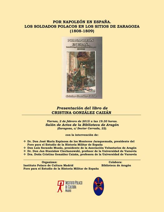 Los próximos días 1, 2 y 3 de febrero, se presentará el último libro de Cristina González Caizán «POR NAPOLEÓN EN ESPAÑA. Los soldados polacos en los sitios de Zaragoza. (1808-1809)»Las presentaciones serán:el día 1 de febrero en Madrid en el Centro Cultural de los Ejércitos, Gran Vía 13, a las 19:00h; el día 2 de febrero en Zaragoza en el Salón de Actos de la Biblioteca de Aragón, c/ Dr. Cerrada 22;y el día 3 de febrero en el Ayuntamiento de San Vicente de la Sonsierra, La Rioja.