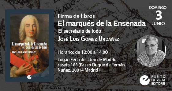 El próximo domingo día 3 de junio firmará nuestro amigo y Forista José Luis Gómez Urdañez su libro: El marqués de la Ensenada. El secretario de todo en la caseta 183, (Paseo Duque de Fernán Nuñez. Madrid), Editorial Punto de Vista Editores, de 12 a 14 horas.