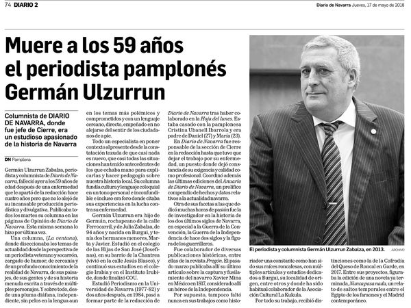Ha fallecido en Pamplona el pasado día 16 nuestro gran amigo y colaborador del Foro Germán Ulzurrun Zabalza. Colaboró con nosotros en múltiples actividades y en la revista Cuadernos del Bicentenario con sus artículos relacionados con Navarra.Siempre te recordaremos. Descanse en Paz.
