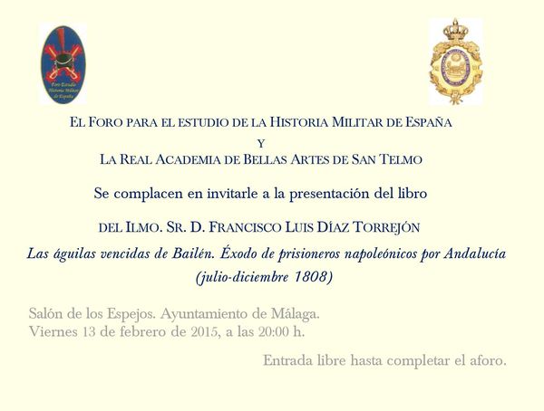 El Foro para el Estudio de la Historia Militar de España acaba de editar el último libro de Francisco Luis Díaz Torrejón, “Las águilas vencidas de Bailen. Éxodo de prisioneros napoleónicos por Andalucía (julio-diciembre 1808)”.El nuevo libro será presentado en Málaga el próximo Viernes 13 de febrero de 2015, a las 20:00 h en el Salón de los Espejos, del Ayuntamiento de Málaga.