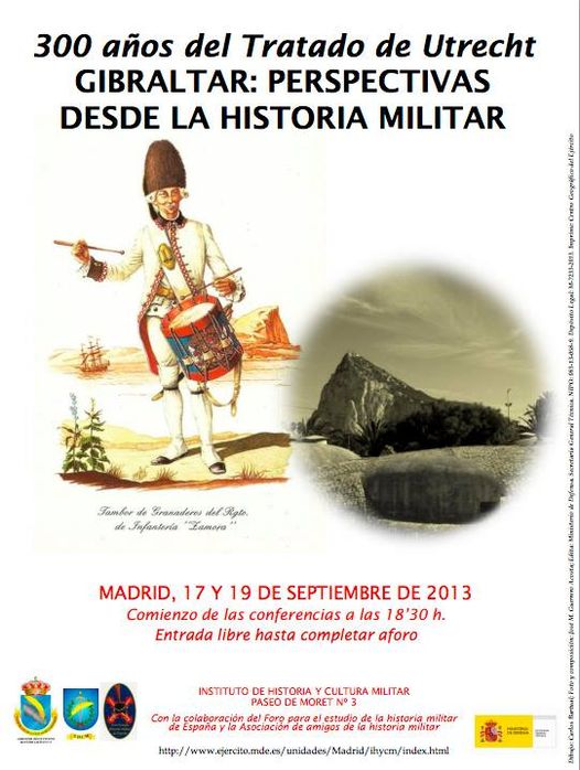 Cartel del ciclo de conferencias «300 años del Tratado de Utrecht GIBRALTAR: PERSPECTIVAS DESDE LA HISTORIA MILITAR» Será en Madrid, los días, 17 Y 19 DE SEPTIEMBRE DE 2013 Comienzo de las conferencias a las 18’30 h. Entrada libre hasta completar aforo Colaboran con el Instituto de Historia y Cultura Militar, el Foro para el Estudio de la Historia Militar de España y la Asociación de amigos de la historia militar. El programa del ciclo de conferencias aquí: http://www.forohistoria.com/facebook/programagibraltar.pdf