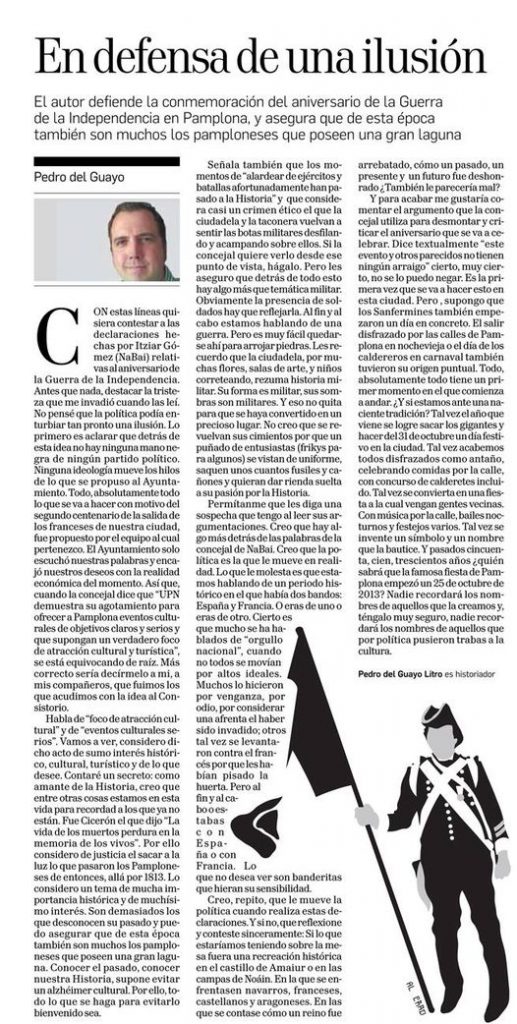 Magnífica respuesta de Pedro del Guayo en el periódico Diario de Navarra, a la injerencia política del nacionalismo vasco «Ande no hay, no hay» al igual que ocurriera en el Bicentenario de la Batalla de Vitoria, con motivo de la presentación de la Iª Recreación histórica Sitio y Capitulación de Pamplona de la que Pedro del Guayo es asesor histórico.